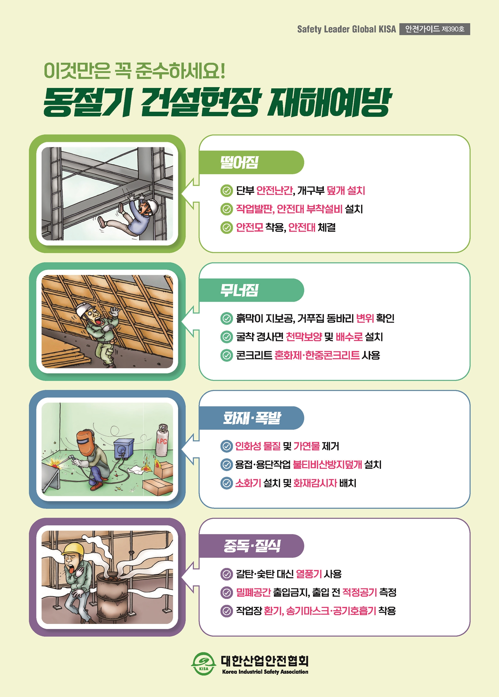 안전포스터 안전포스터 안전보건표지 교육자료 재해사례 서식자료 동절기 건설현장 재해예방 ⓒ 대한산업안전협회 ∥ 무단도용, 복제 및 재배포 금지 제390호_동절기 건설현장 재해예방.jpg 이전글 근골격계질환 예방을 위한 안전수칙 다음글 감전 사고 예방을 위한 안전수칙 목록